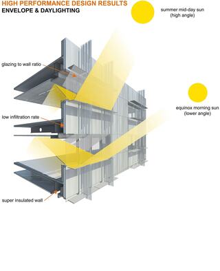 This project’s high-performing facade system is automated to respond to sun position and sky conditions, maximizing views without glare and enhancing users’ connection to the outdoors.