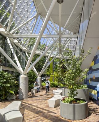 Overlooking the Willamette River, the Salmon Street Springs fountain, and the heart of Tom McCall Waterfront Park, the World Trade Center campus attracts the attention of countless passers-by with its iconic architecture, elevated bridges, and pedestrian walkways. Now, the building has a plaza that serves employees and visitors just as effectively.