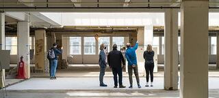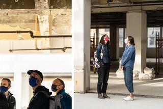 The 37,000-square-foot, uninterrupted floorplate of the fifth floor spans a full city block and sits beneath a historic, steel-frame skylight. Knowing how curious staff would be about the vibrant office environment we’re designing here, and how difficult it would be to describe, our Viz team developed augmented reality visualization points throughout the space, which could be accessed by mobile devices. Our Workplace team was also on-hand to fill in the blanks, and talk about the layout, amenities and flexibility of our new office.