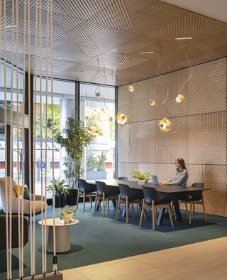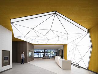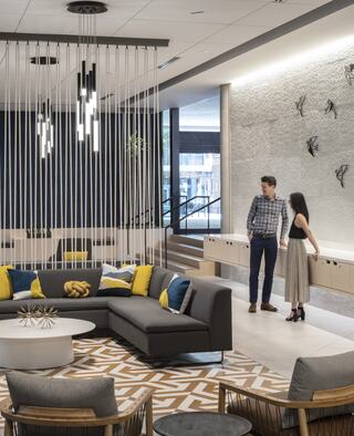 A new lobby experience works in tandem with the crystal-like character of the exterior. Behind the reception desk, a bold custom faceted light fixture wraps from the ceiling and draws visitors into the space from the two main entry points.
