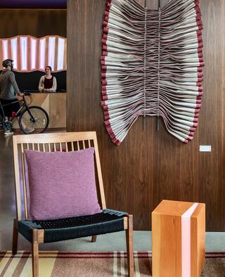 The custom public space was a nod to the brand’s aesthetic through the tailored, timeless details of men’s suiting and Portland’s craft culture—as showcased through local art in various forms. The neutral palette and integrated art niches, designed with specific art pieces in mind, create a gallery-style experience for locals and guests alike.
