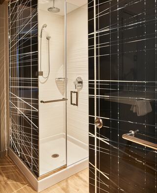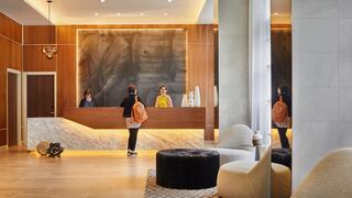 The lobby bar is a main focal point of the design. It’s warm and timeless material pallet along with strong symmetry create a refined visual anchor in the compact hotel lobby.