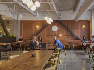 This two-floor office space is home to distinct workplace groups that might never interact with each other in a typical office setting. Adding a new double-height opening aligns this space with our client’s collaborative and social spirit by connecting people across a bustling amenity zone that spans both levels and draws employees to the center for sustenance and relaxation.