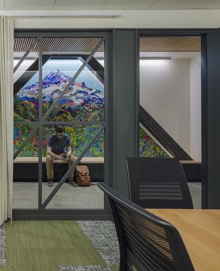 “This workplace project anticipates the modes in which people are working now while promoting connection among individual site users and the broader Portland tech community. A palette of simple, natural materials, discoverable moments, and local art and humor connect users to the city and region.”