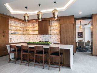 Walnut paneling and warm brass add layers of texture and sophistication to a timeless neutral palette.