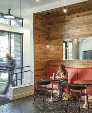 Designed with a nod to the original Streamline Moderne style of the 1940s gas station, which formerly occupied the site