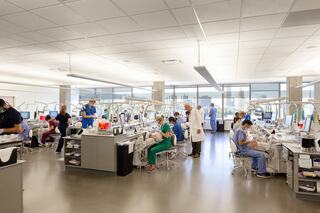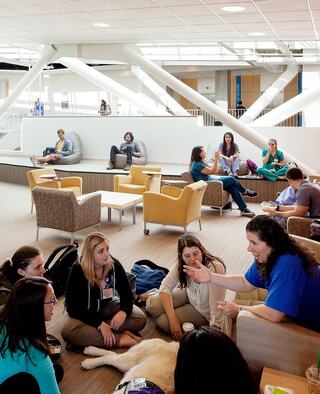 Located on a former brownfield site constrained by adjacent roadway and bridge construction, Robertson CLSB was conceived as an innovative model of interdisciplinary health sciences education, research, and education. It engages students, faculty and pedestrians through a concept of “science on display.” A glass atrium serves as the front entrance, encouraging passersby to look in and different program members to observe what their peers are doing.