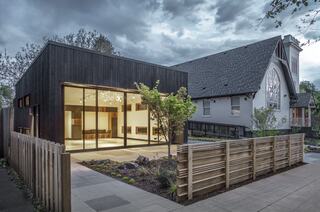 A new, modern outbuilding complements the historic church, providing dedicated rehearsal and community space, along with a production shop for set construction. Here, the design team focused on energy savings and occupant comfort, incorporating low-tech and passive solutions such as skylights that bring in natural light and minimize utilities.