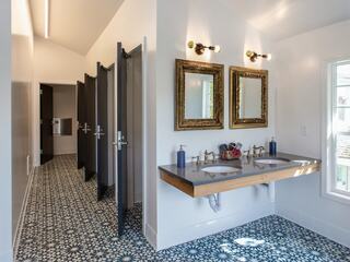In the Playhouse's basement, SERA's design brought daylight and openness to the behind-the-curtain spaces, incorporating new offices, dressing rooms, a green room, kitchen, and communal area. On the first floor, the public-facing lobby got a refresh, with existing facilities converted into gender-neutral bathrooms. The team also explored options for a facelift of the west elevation at the public office entry in the basement.