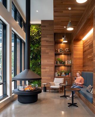 Slabtown’s name comes from the district's lumber mills that would sell slabs of log edges as a cheap source of fuel. Located within the larger Slabtown neighborhood, Saltwood’s design serves as an homage to Portland’s historic lumber industry through integration of natural materials and warm wood finishes throughout the building.