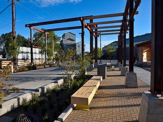 Complementing the community’s unique geographic setting, the streetscape design evokes the town’s modern western character by sourcing natural soft woods and forged metal. Groves of attractive white-bark columnar trees cluster in wildflower-strewn landscape planters along the street providing pockets of shade and protection from traffic. Iimprovements include new concrete paver sidewalks and ADA-accessible curb ramps, curb extensions, bio-retention stormwater facilities, pedestrian-scale street lighting, street trees, benches, drinking fountains, bicycle parking, wayfinding signage, and waste containers.